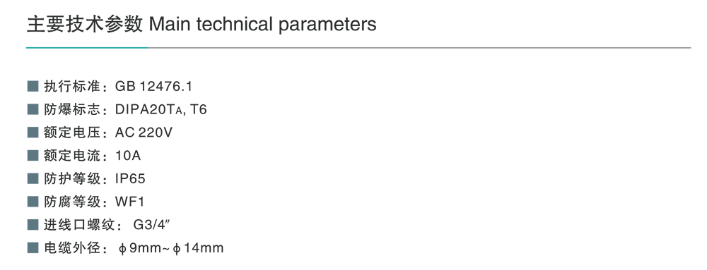 壳体采用ZL102铝合金压铸成型,表面粉末静电喷塑,结构紧凑,外形美观;产品具有防水、防尘等特点;钢管或电缆布线。