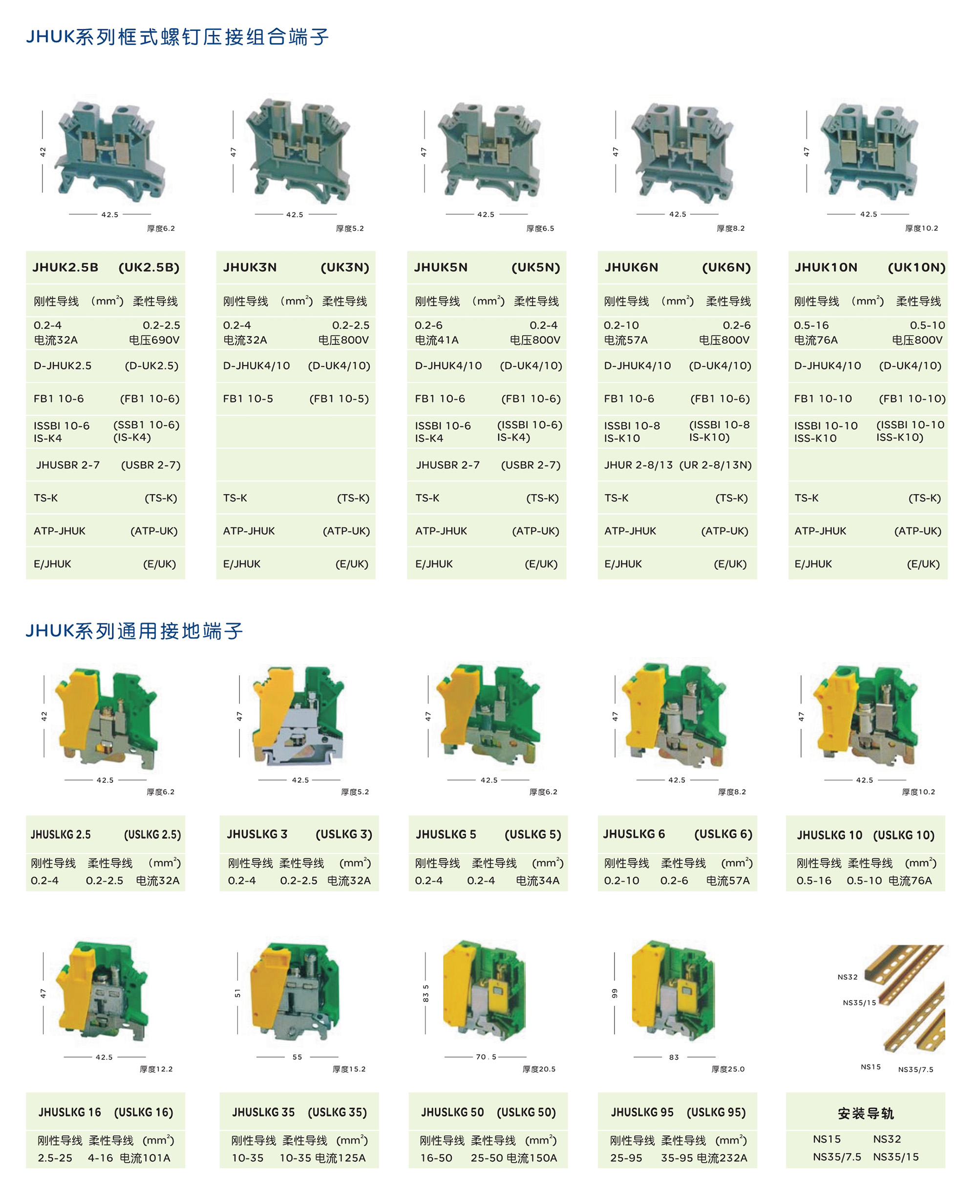 JHUK系列组合端子排采用框式螺钉接线结构,设计符合IEC60947-1、GB14048等标准,产 品用于交流50Hz(60Hz),额定电压660V、直流440V以下电路额定截面为0.75-150mm²的 连接导线,也适用于未经过特殊加工或压接管状端头的圆铜导线连接之用。