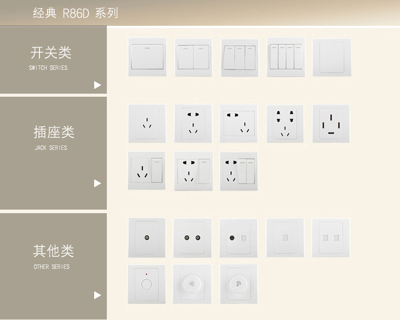 型号:R86D-K1(单控),R86D-K2(双控),R86D-K3(多控) 一联开关;颜色:乳白